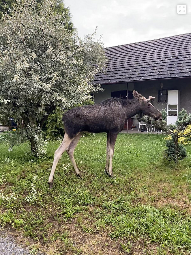 „Los se mezitím usídlil na zahradě jednoho domu, kde si pochutnával na čerstvé snídani – listech stromů. Policisté se ho pokusili zlákat na mrkev, ale zvíře mělo jasno: jen zelené a bio,“ upozornila mluvčí policie Monika Kozumplíková.
